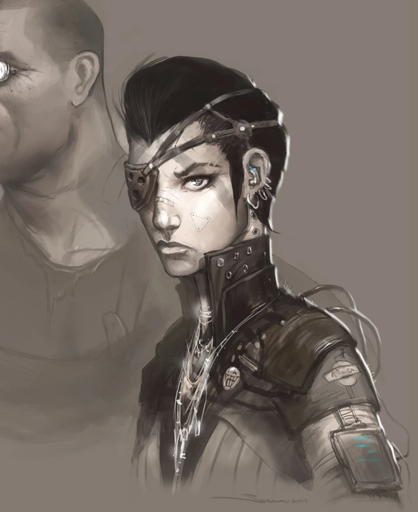 In keeping with the stated 'cyberpunk' theme for Stark and especially Europolis, Mira appears to sport several cybernetic modifications: at least one of her eyes, data-jacks in her neck, a small hatch in her cheek, and several cables running over her shoulder.